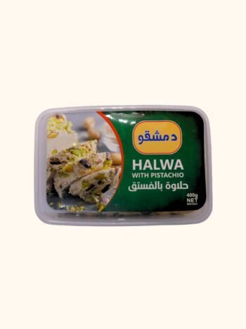 حلاوة دمشقية بالفستق هي حلوى شرقية تقليدية مصنوعة من الطحينة الغنية بالسمسم المحمّص وقطع الفستق الكاملة. قوامها طري ومفتّت قليلاً، مع نكهة سمسم قوية وحلاوة متوازنة تمنح شعوراً بالشبع والطاقة.