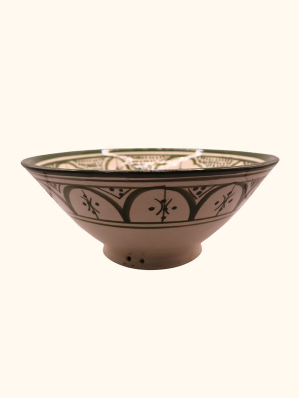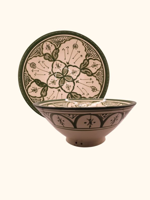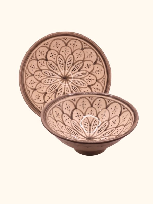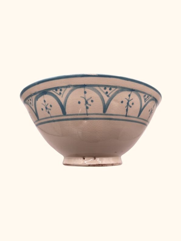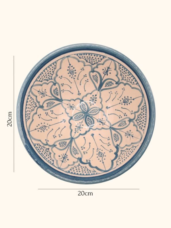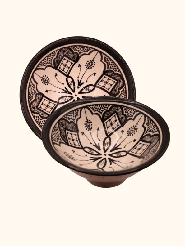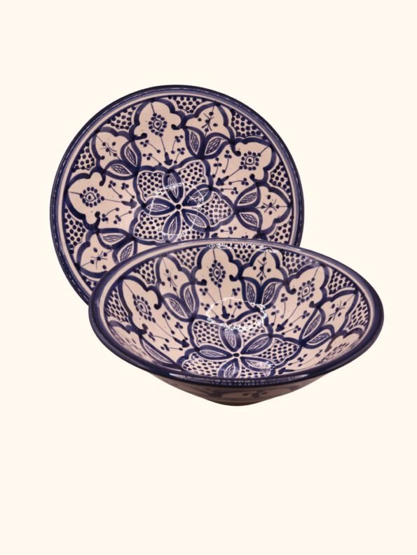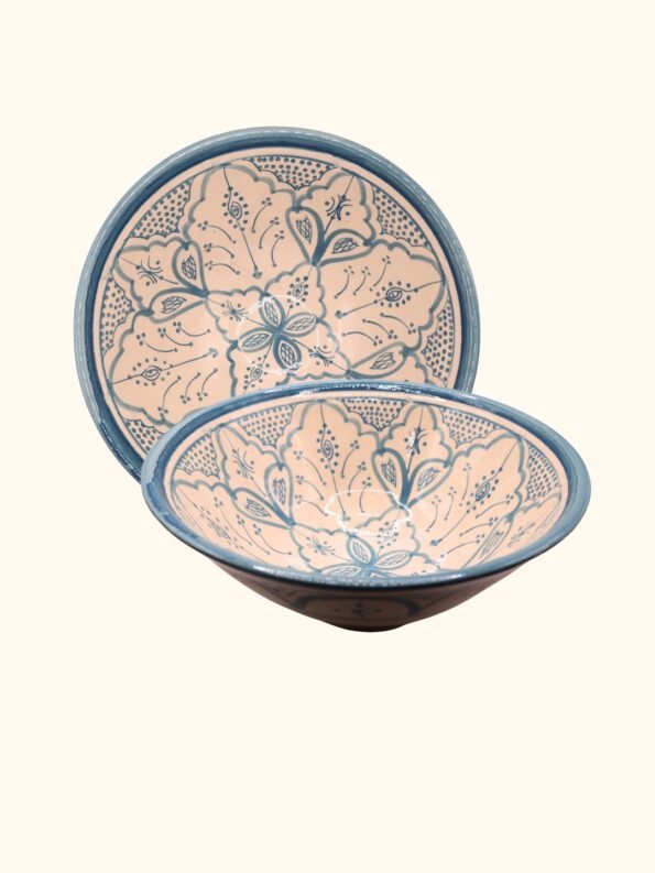 هذه الأوعية المغربية مصنوعة ومزخرفة يدويًا بواسطة حرفيين مهرة، وتحمل تصاميم هندسية ونباتية متقنة بألوان الأزرق والبيج والقرميدي. يتم صنع كل وعاء من طين طبيعي وألوان ذات جودة عالية، ليكون كل وعاء قطعة فنية فريدة تضيف الفخامة والجو المغربي الأصيل إلى أي مائدة أو ديكور منزلي.