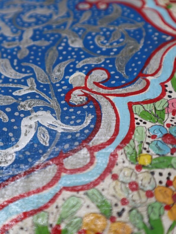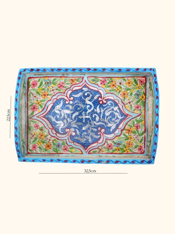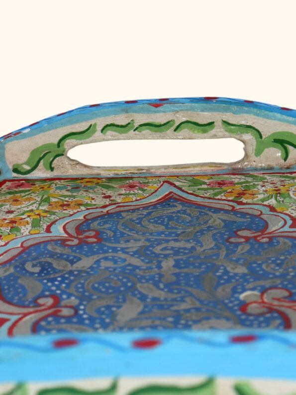 هذه الصينية مصنوعة من الخشب ومُلوَّنة يدويًا بالكامل على يد حرفي مغربي، وتتميز بنقوش متعددة الألوان مرسومة بإتقان على قاعدة من الخشب. تمتزج الدرجات الدافئة والباردة في زخارف ذات طابع تراثي، ما يمنحها شخصية مميزة ويجعل كل قطعة فريدة من نوعها كعمل فني وقطعة عملية للاستخدام اليومي.