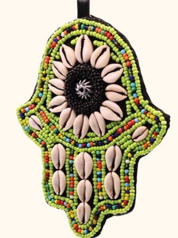 يد فاطمة مغربية مزخرفة، مصنوعة يدوياً على أيدي حرفيين باستخدام أصداف الكاوري الطبيعية وخرز زجاجي ملون على قاعدة متينة. يضفي مزيج الخامات والألوان الزاهية لمسة تراثية مميزة، وينشر طاقة وقائية في أي مكان.