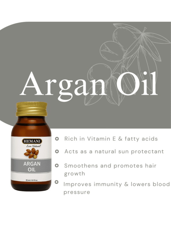 Hemani Argan Oil is 100% pure, unfiltered, and cold-pressed from Moroccan argan kernels, known as “liquid gold” for its golden hue and exceptional benefits. Rich in oleic acid (43-49%), linoleic acid (29-37%), vitamins A, C, E, and antioxidants, it supports skin and hair care, immune health, and inflammation reduction.