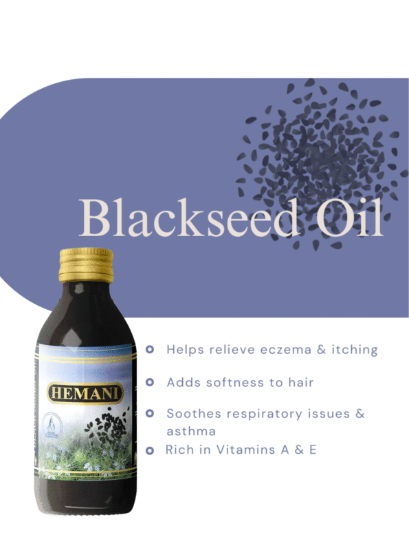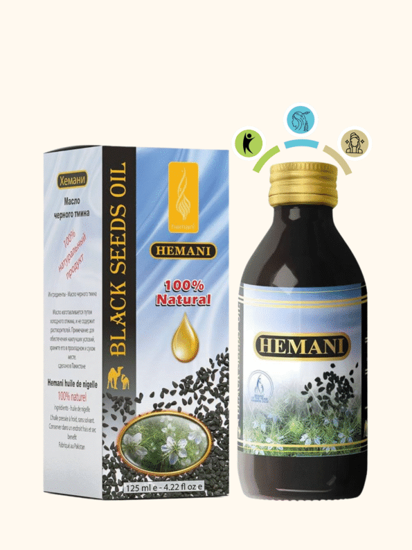 Hemani Black Cumin Seed Oil is a premium, 100% natural, cold-pressed oil extracted from Nigella sativa seeds. Unfiltered and additive-free, it is vegan and packaged in eco-friendly glass and cardboard to ensure purity and freshness. Traditionally valued for its rich, earthy flavor and versatile uses in cooking and personal care.