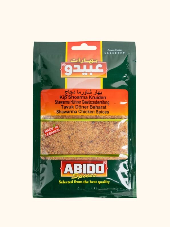 Abido Chicken Shawarma Spices is an aromatic spice blend for chicken shawarma, with authentic Lebanese origins and a strong, Mediterranean character. The blend combines salt, white pepper, mahlab, cardamom, red chili and other spices, giving a rich flavor and characteristic aroma to the chicken marinade.