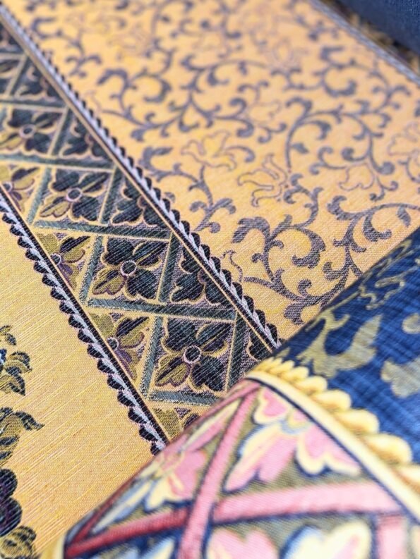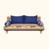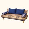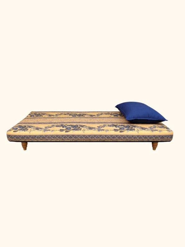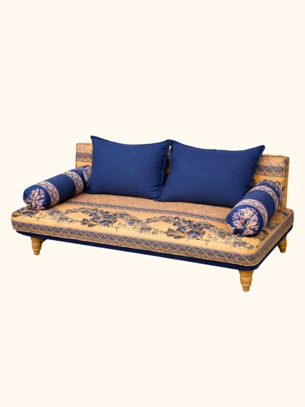 This sofa bed combines practicality and luxury with its boho oriental design. Crafted from solid wood for durability and stability, it features a rich fabric design with a golden yellow base and blue details, adding an authentic Arabian touch.