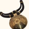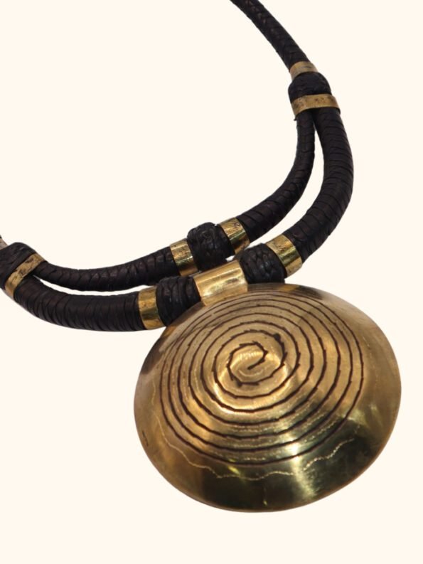 This handmade Moroccan necklace combines a leather cord with a striking round brass pendant featuring a spiral motif. The dark leather enhances the luxurious look of the brass, creating an authentic and unique piece. Each necklace is crafted using traditional techniques by skilled artisans, with careful attention to details and materials