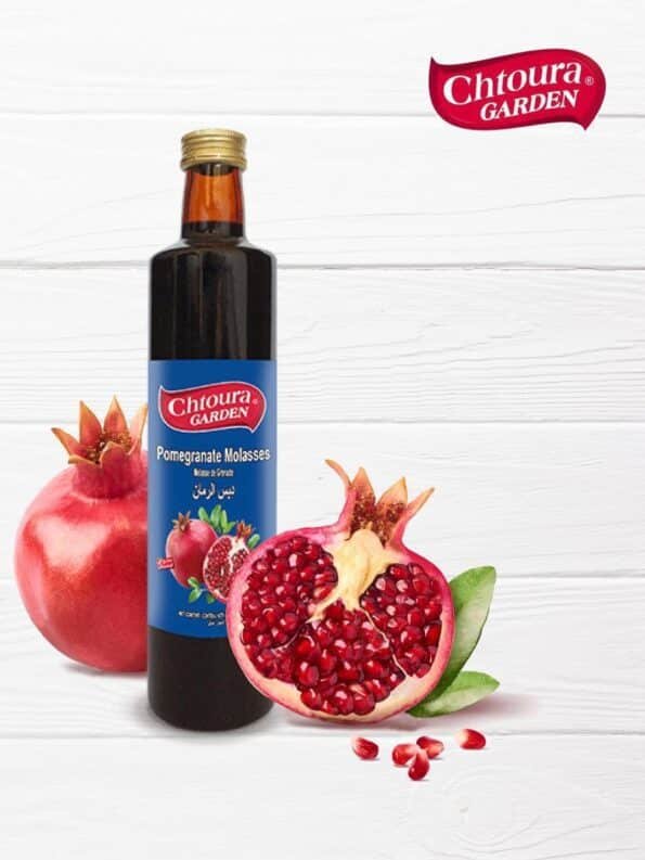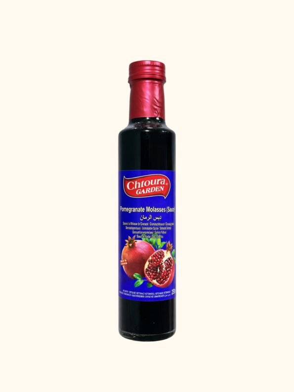 Chtoura Garden pomegranate molasses is an authentic Lebanese concentrate made from 100% juice of ripe pomegranates, featuring a thick texture, dark red color, and distinctive sweet-tart flavor that evokes the freshness of the Middle East. Renowned for its tannins and acidity, it adds depth to salads, marinades, and dishes while being rich in antioxidants for health and well-being. Widely used in Lebanese and Middle Eastern cuisine, it enhances fattoush salads, meats, chicken, grilled vegetables, or even desserts.