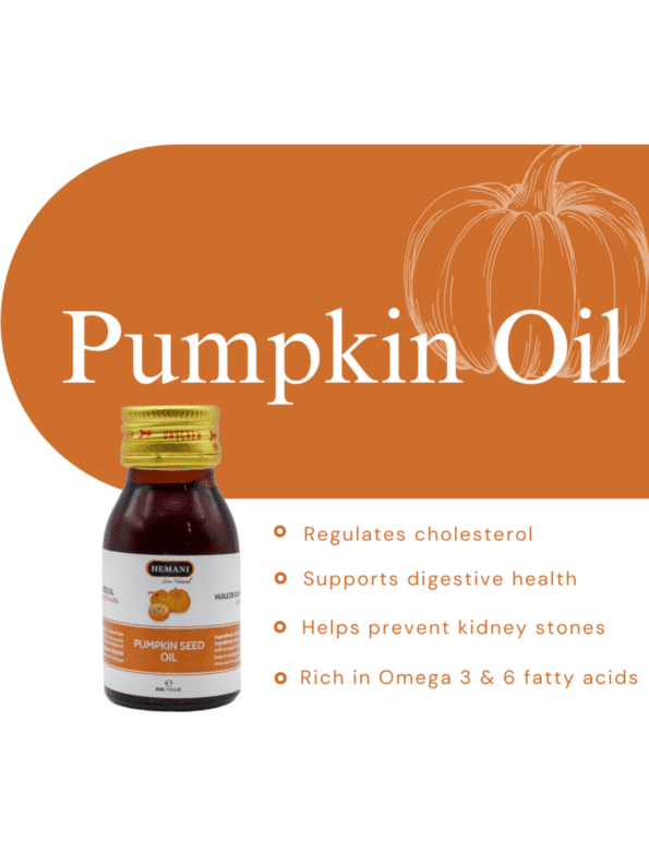Hemani Pumpkin Seed Oil is a pure, 100% natural oil extracted from roasted pumpkin seeds, with a pleasant nutty flavor and a rich profile of omega 3 and 6 fatty acids, amino acids, vitamin E, and minerals. It supports heart and cholesterol health when used in food and is also popular for nourishing skin, hair, and overall well-being.