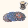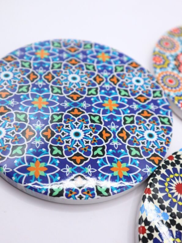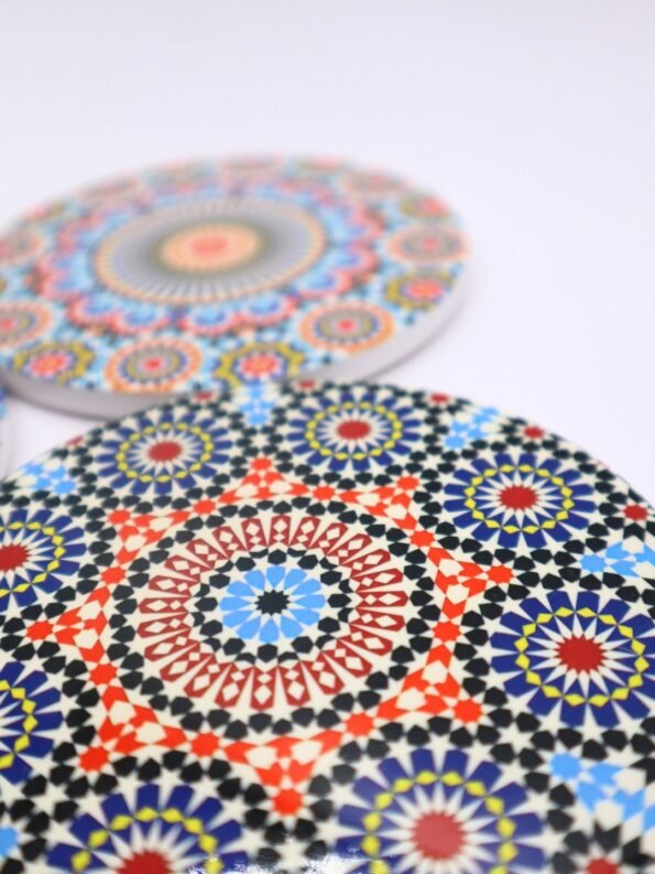This set includes 3 round Moroccan coasters with different, colorful zellige patterns in blue, red, yellow, and turquoise shades. Each design resembles traditional geometric tiles, turning the serving of coffee or tea into a small aesthetic experience.