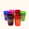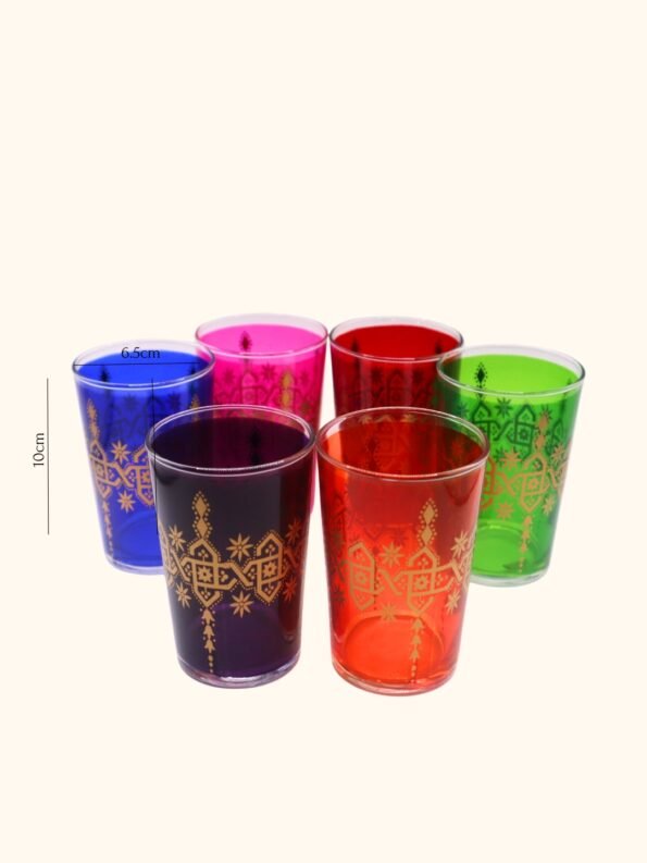 This set includes 6 Moroccan tea glasses in vibrant colors (blue, green, red, orange, fuchsia, purple), decorated with golden oriental motifs. The thin glass and vivid shades make each piece stand out, creating an impressive display on the table whether used together or individually.