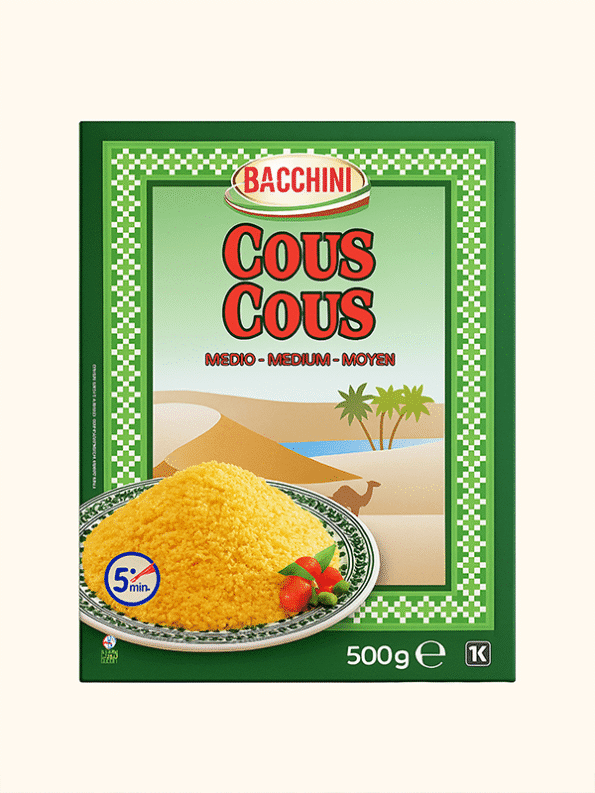 Το couscous Bacchini είναι παραδοσιακό σημιγδαλένιο ζυμαρικό, άμεσα έτοιμο σε 5 λεπτά, ιδανικό για μαροκινά, αραβικά, μεσογειακά και φαγητά της Βόρειας Αφρικής. Με μεσαίο μέγεθος κόκκου, έχει αφράτη υφή και λειτουργεί ως άριστη βάση για λαχανικά, κρέας, θαλασσινά ή πικάντικες σάλτσες. Πλούσιο σε υδατάνθρακες και ήπιο γευστικά, “αγκαλιάζει” αρώματα και συνδυάζεται εύκολα με μυρωδικά και καρυκεύματα.