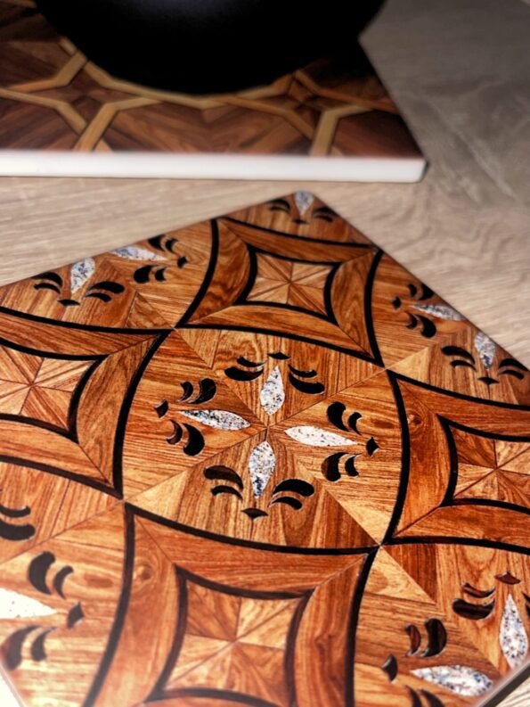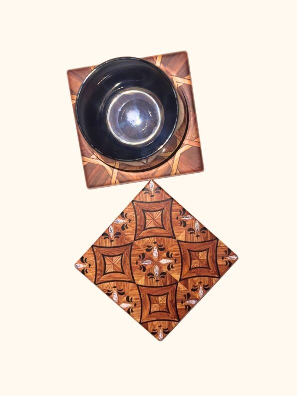 Αυθεντικό σετ 2 σουβέρ από πολύχρωμο ξύλο και μάρμαρο σε μαροκινά γεωμετρικά σχέδια, ιδανικά για προστασία τραπεζιών και προσθήκη oriental πολυτέλειας από την μαροκινή παράδοση.