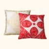 Αυτά τα μαροκινοί κεντητά μαξιλάρια είναι εξ ολοκλήρου χειροποίητα από φυσικό ύφασμα, με πλούσιο κέντημα σε φυτικά μοτίβα λουλουδιών, φύλλων και γεωμετρικών σχημάτων σε κόκκινο και χρυσό πάνω σε λευκό/εκρού φόντο. Η λεπτομερής, ανάγλυφη διακόσμηση χαρίζει θηλυκή έθνικ αισθητική και κάνει κάθε κομμάτι πραγματικά μοναδικό.