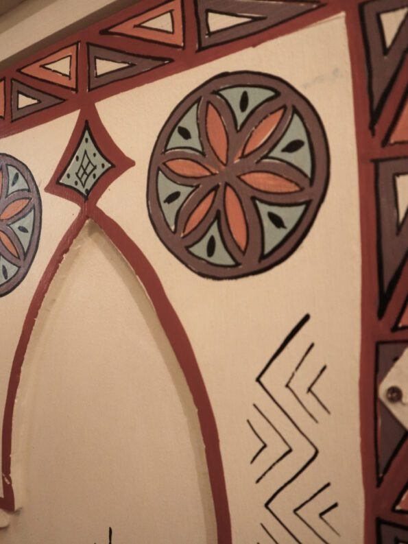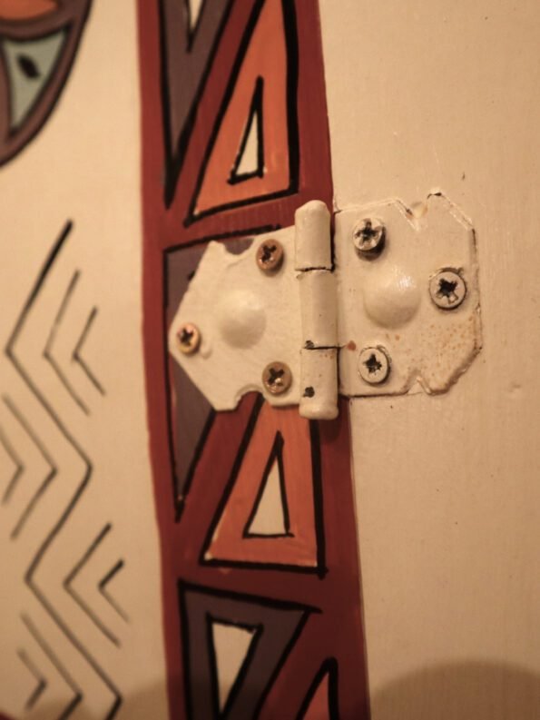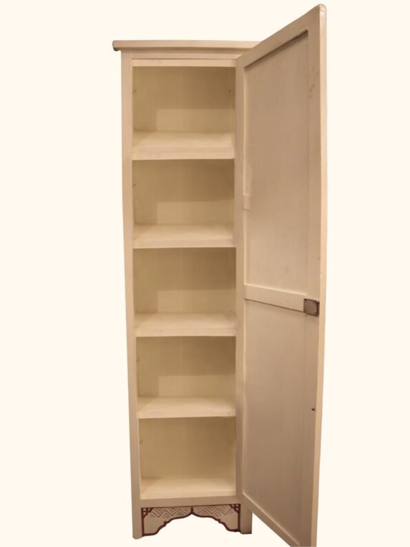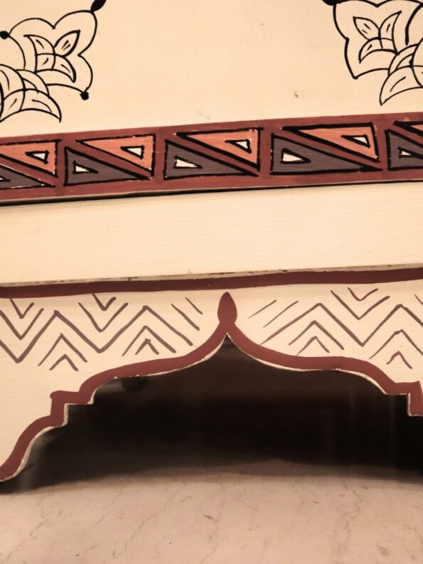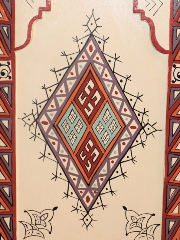 Εντυπωσιακό, χειροποίητο, μοναδικό κομμάτι, ζωγραφισμένο σε φυσική λευκή βάση με περίτεχνα βερβερικά και μαροκινά μοτίβα, ζωγραφισμένο στο χέρι σε γήινα και έντονα χρώματα. Είναι κατασκευασμένο από μείγμα μασίφ πεύκου και ανθεκτικού ξύλου, εξασφαλίζοντας σταθερότητα και αυθεντική αισθητική. Διατίθεται αποκλειστικά σε ένα κομμάτι στο eshop, καθώς παράγεται από Μαροκινούς καλλιτέχνες με μεγάλη ποικιλία κάθε φορά, καθιστώντας το πραγματικά μοναδικό.