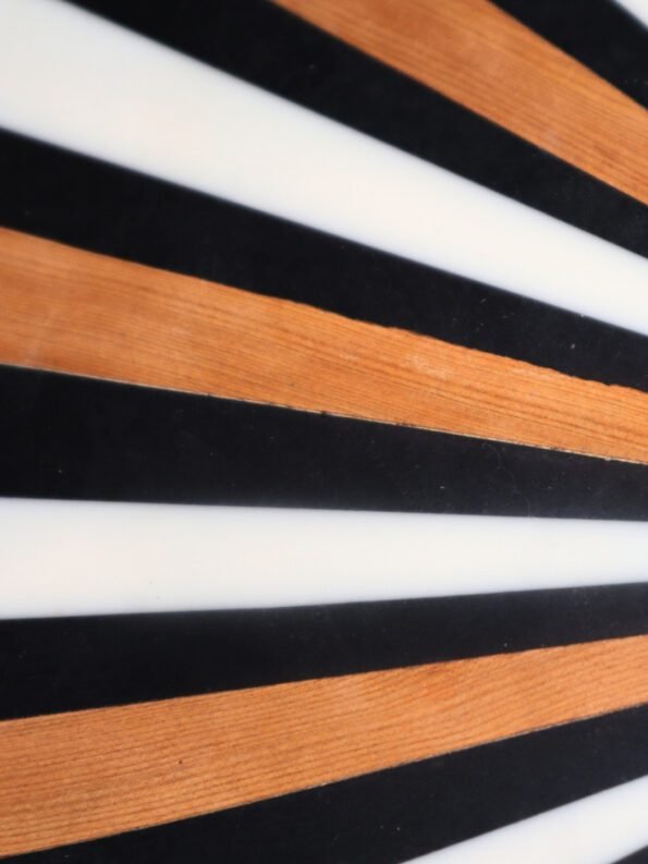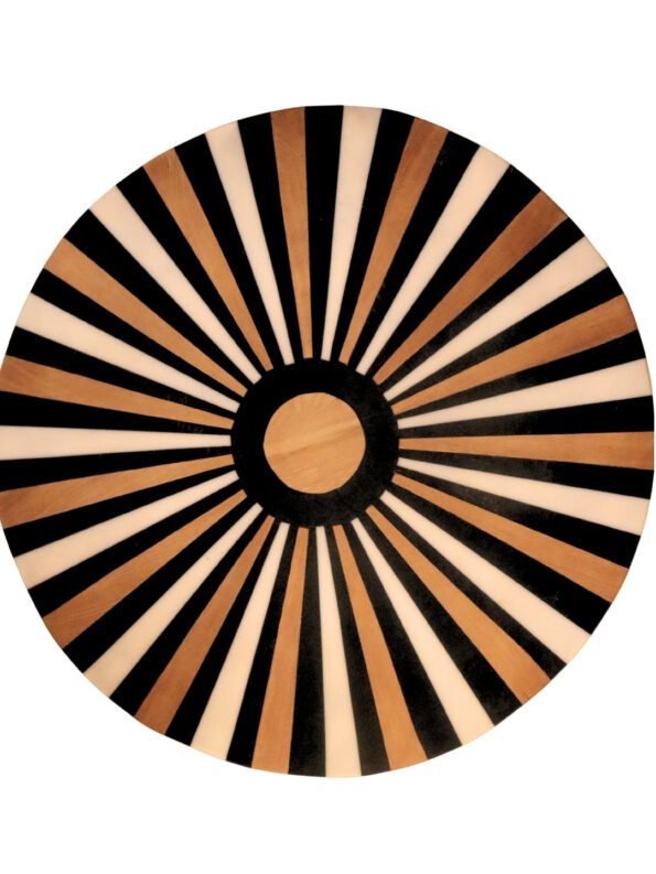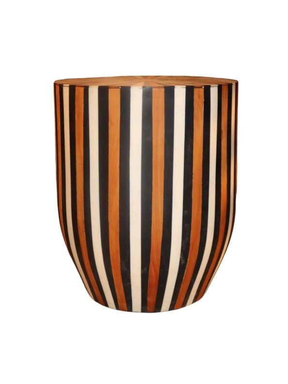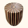 Στρογγυλό μαροκινό σκαμπό από μασίφ ξύλο με έντονο δίχρωμο γραμμικό σχέδιο και ακτινωτή επιφάνεια, χειροποίητο και διακοσμημένο. Είναι ένα εντυπωσιακό κομμάτι για κάθε χώρο.
